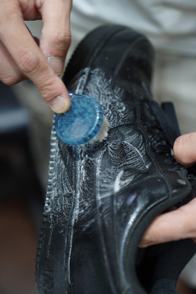 3:ブラシを水に浸し、泡立つようにこすって汚れを落とします。