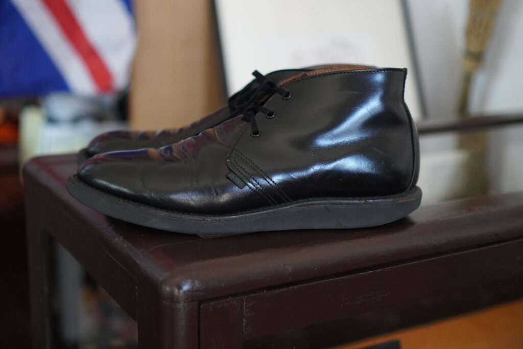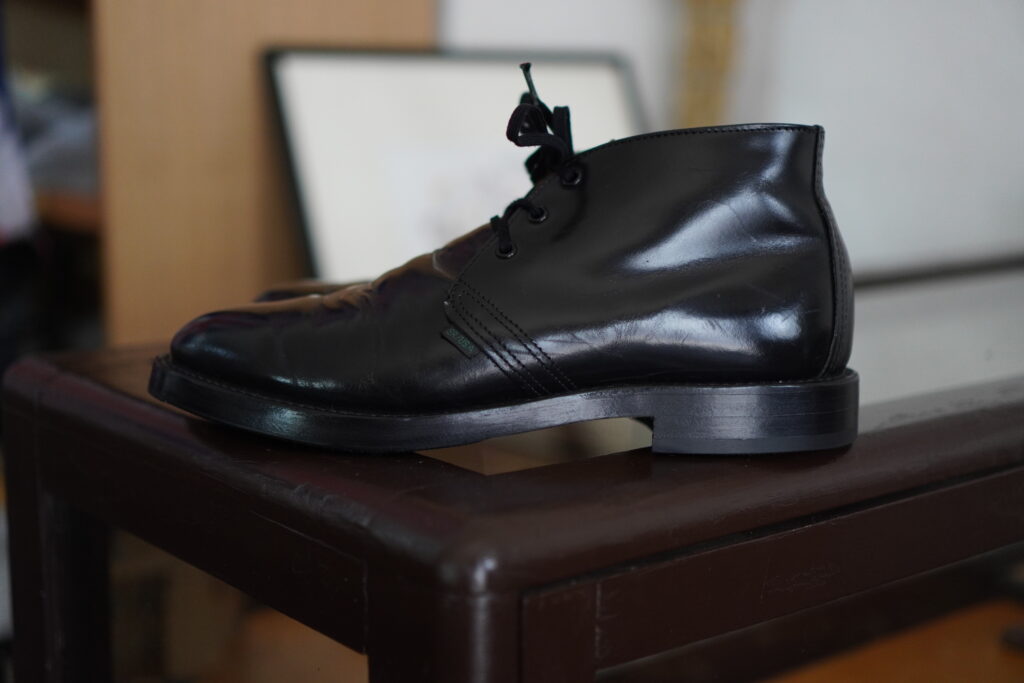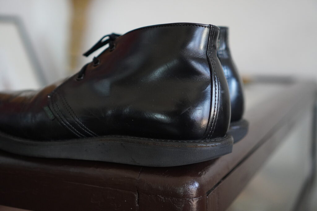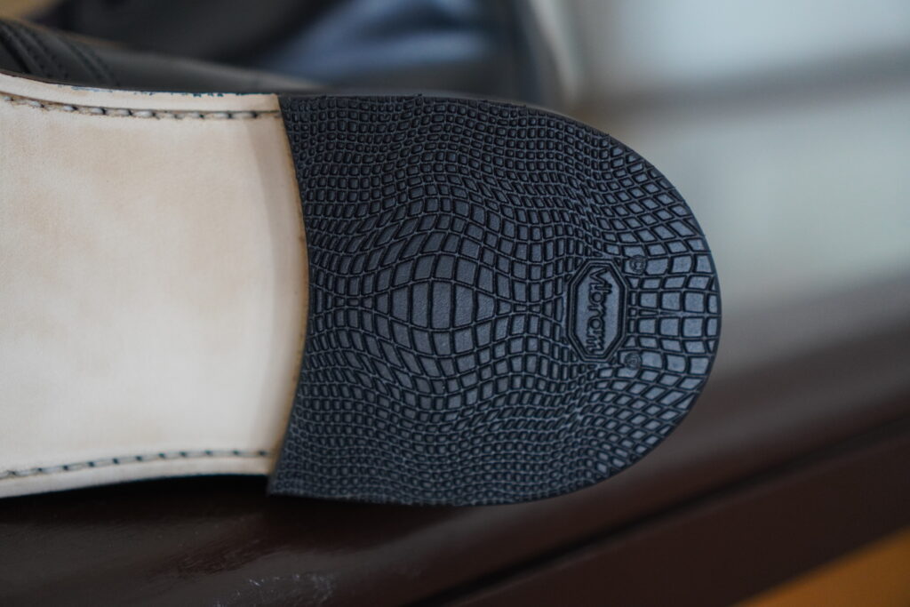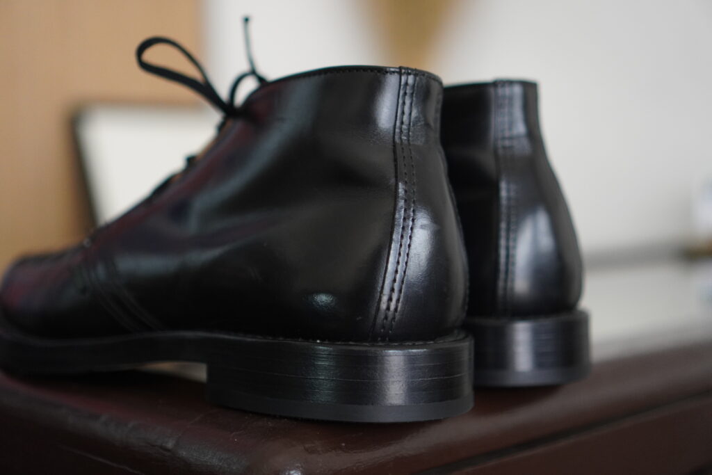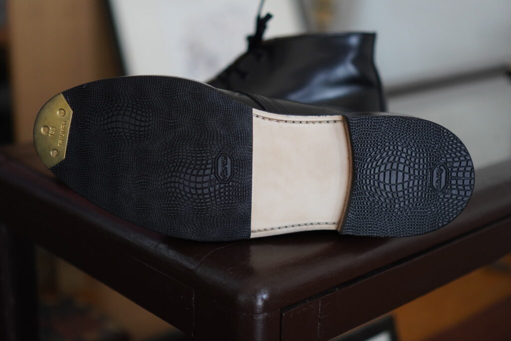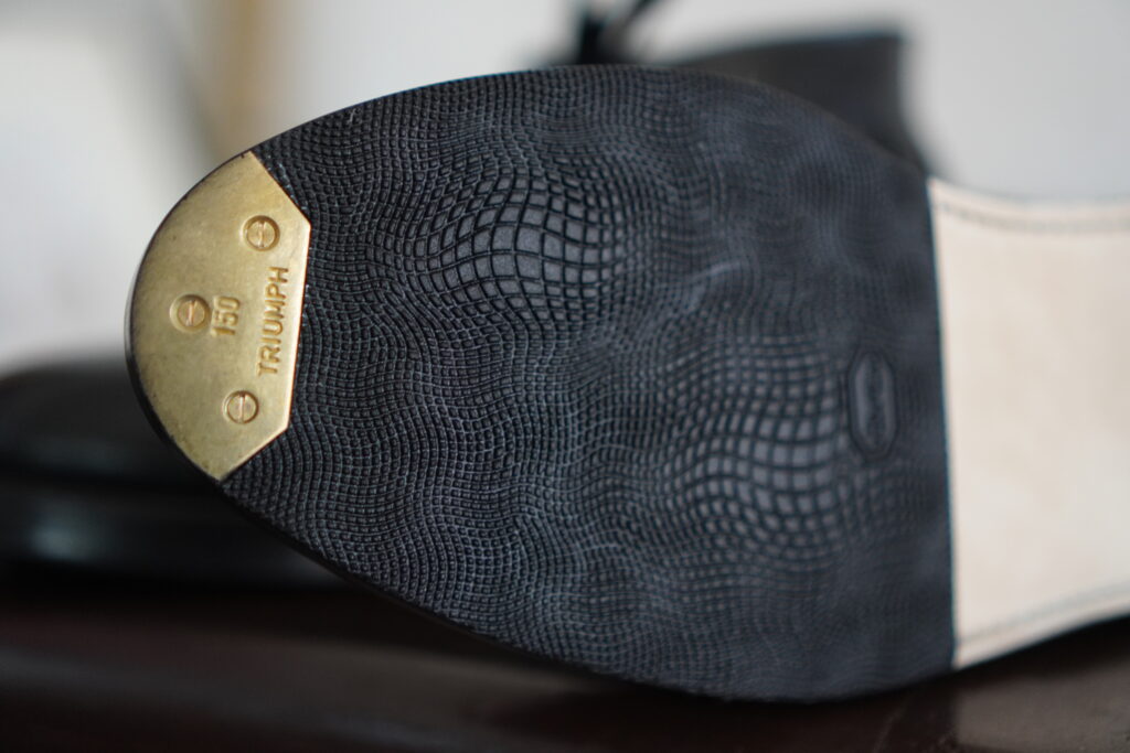 セパレートされたソールによりカカトが付くことでそれだけでも結構雰囲気変わりますがコバをざらつきのない仕上げ、さらにレザーソールでつま先にトライアンフスチールを取り付けるとこれまた一気に見た目変わります。