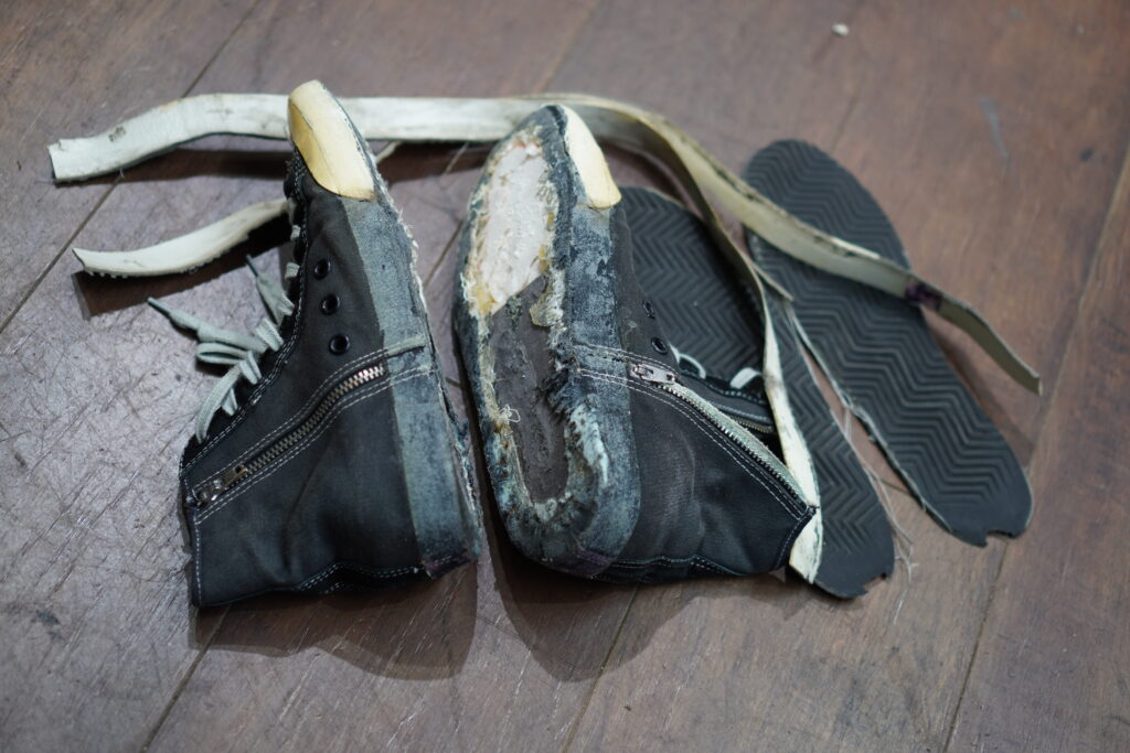さてこれを全部取り除いて修理するわけですが。実は修理屋にとって「綺麗に直す」のはそこそこの経験を積めば出来る人も多いのですが、「純正に習い直す」って意外と難しかったりします。それは革靴でもスニーカーにも言えることなんですが純正よりも綺麗になりすぎると本物感が無くなるし、とは言え純正よりも雑な仕上げだと「単なる雑な修理」って具合に振り分けられます。だからこそ修理の面白さや醍醐味を感じる部分でもあるわけでして。