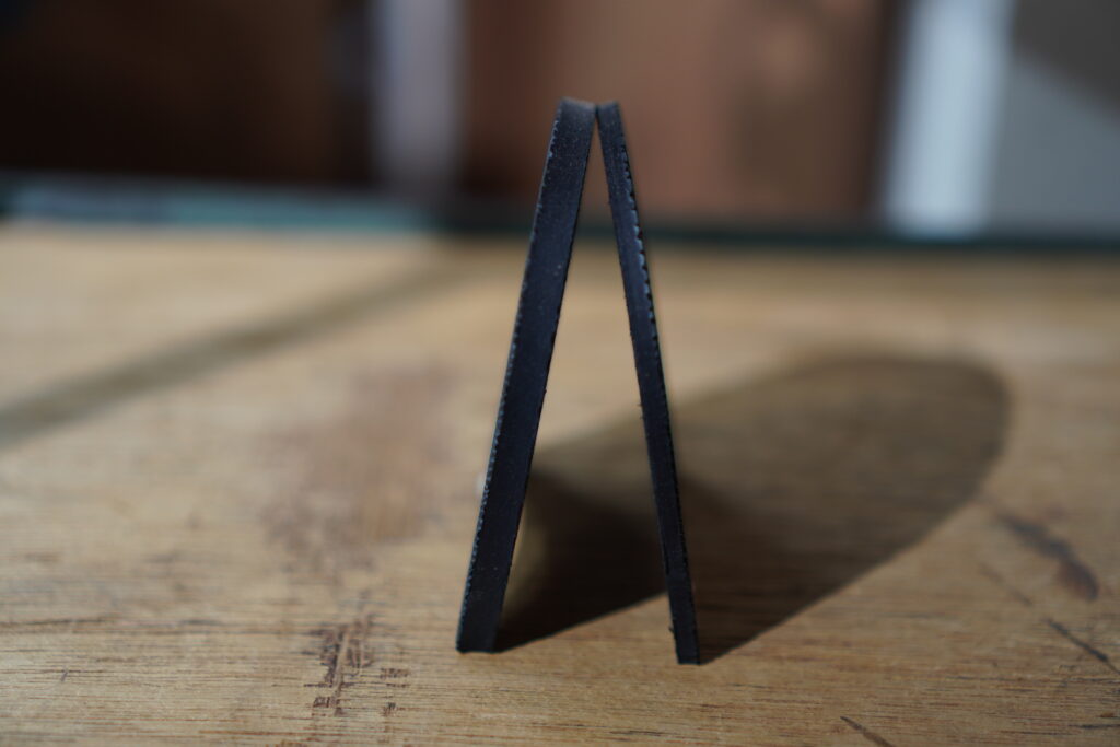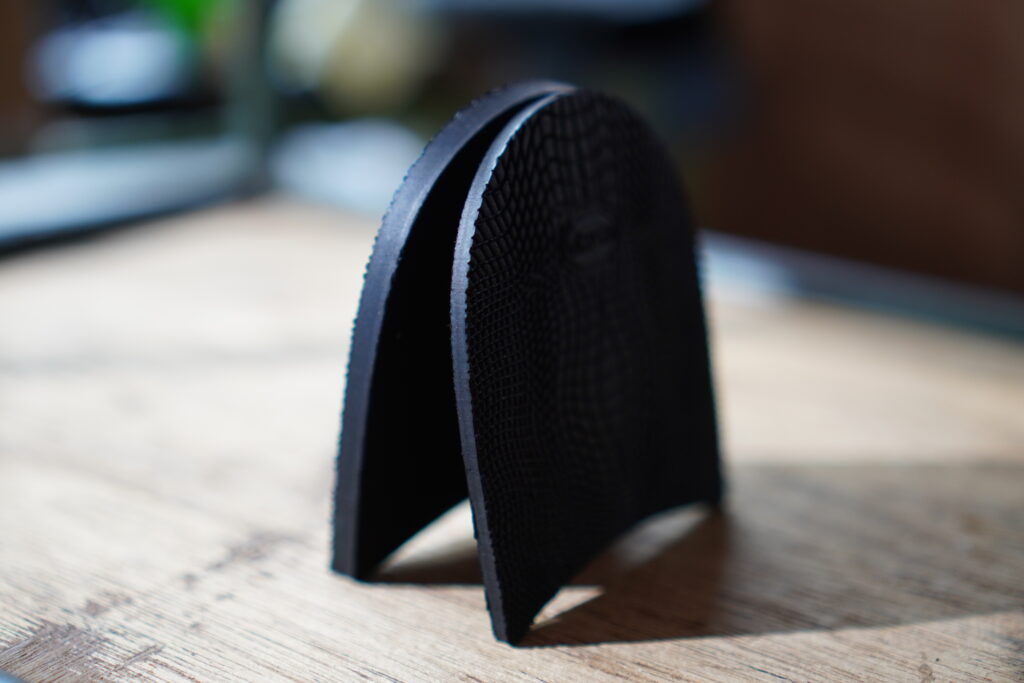 左が昔から元々あった7ミリのラバー。それを新品時にカカトの上から張ってもそこまでバランスが崩れることが無いだろうということで7ミリのラバーを3mに薄くしたものが左。このカカト結構優秀です。ところで足袋の裏張りを承る際に「カカトにも張った方がよいか?」の質問を本当に多く受けます。いつかもブログにも書かせていただきましたがオリジナルのカカトを減らしたくない方は張った方が良く、減ったら交換すればいいやって方は特に張る必要はございません。要するにお客様の自由というわけです。