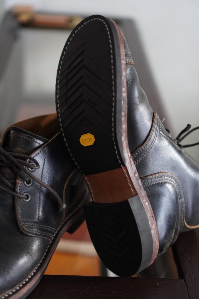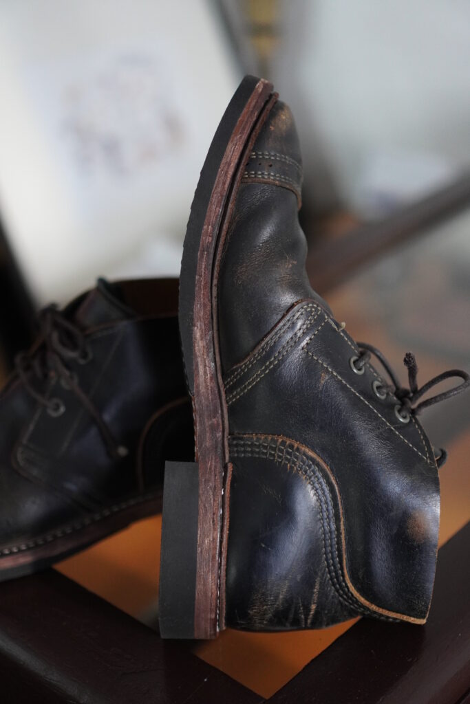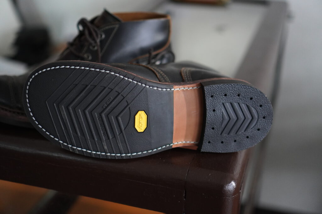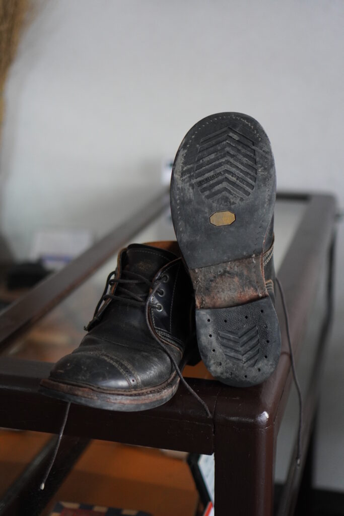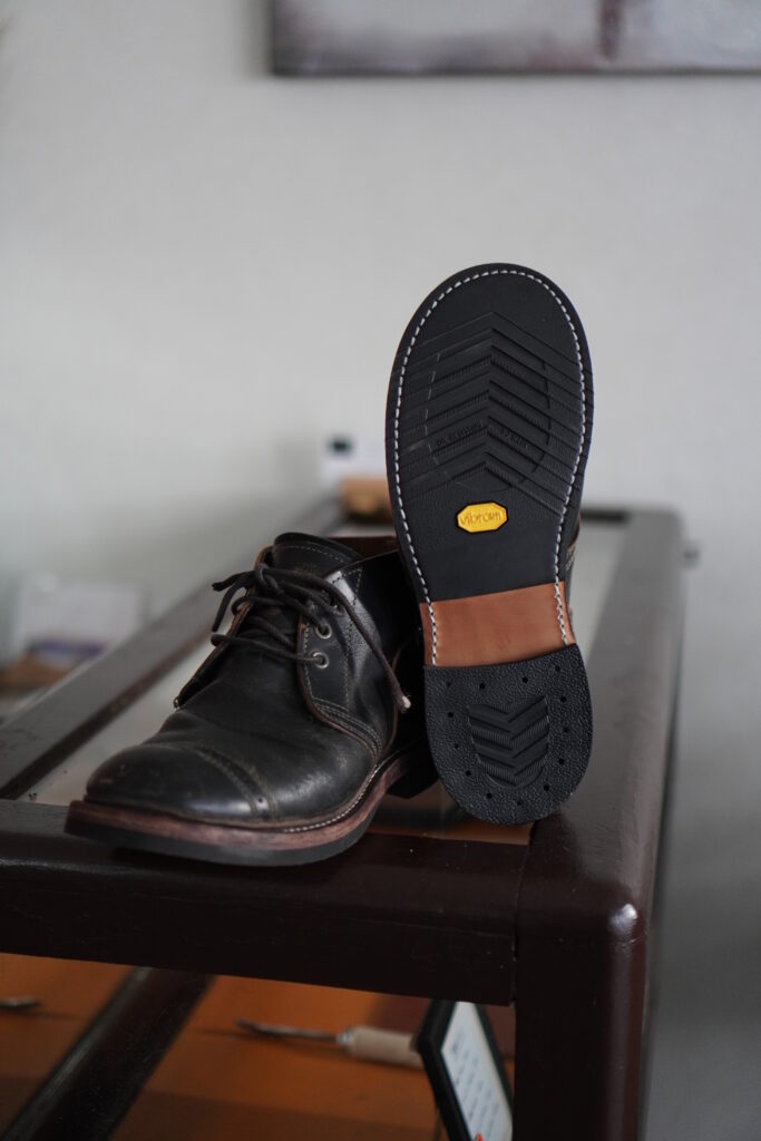 通常のオールソールですと当然コバもシャキッと揃え色もしっかりと着色しますが写真のように、お客様のリクエストに基づきヴィンテージ加工を施しアッパーとのバランスを考えました。いかがでしょうか?この辺こうしたいなーというリクエストがあれば出来る限りお応え出来るようにしております(難しい場合もあります。。。)。皆様のご来店心よりお待ちしております!